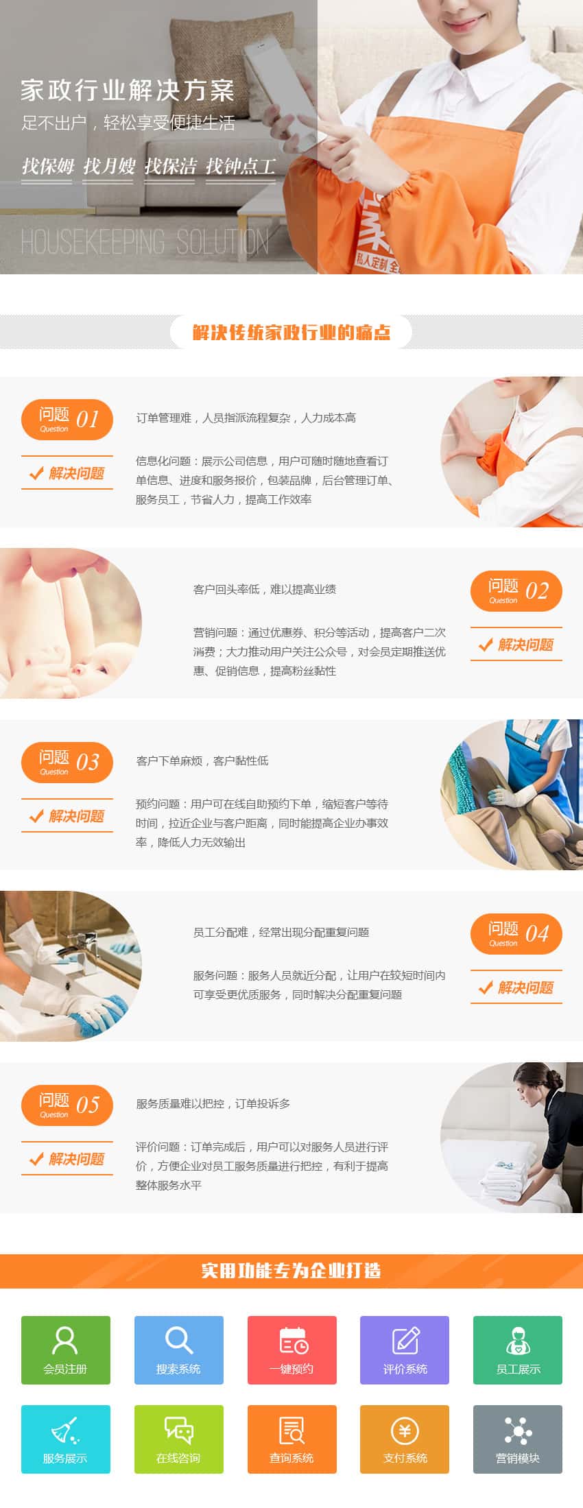 1、信息化问题:展示公司信息,用户可随时随地可查看订单信息、进度和服务报价,包装品牌,网站后台管理订单、服务员工,节省人力,提高工作效率。